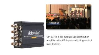 Datavideo VP-597, A / B girişleri anahtarlama kontrollü (kilitli olmayan) altı çıkışlı bir SDI dağıtım amplifikatörüdür